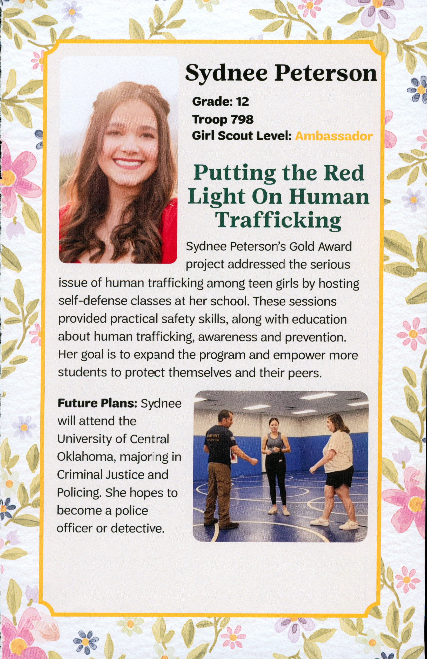 Sydnee selected human trafficking as her community issue and put on self defense classes at Moore High School coordinating with both the Moore Police Department and the Moore Public Schools.